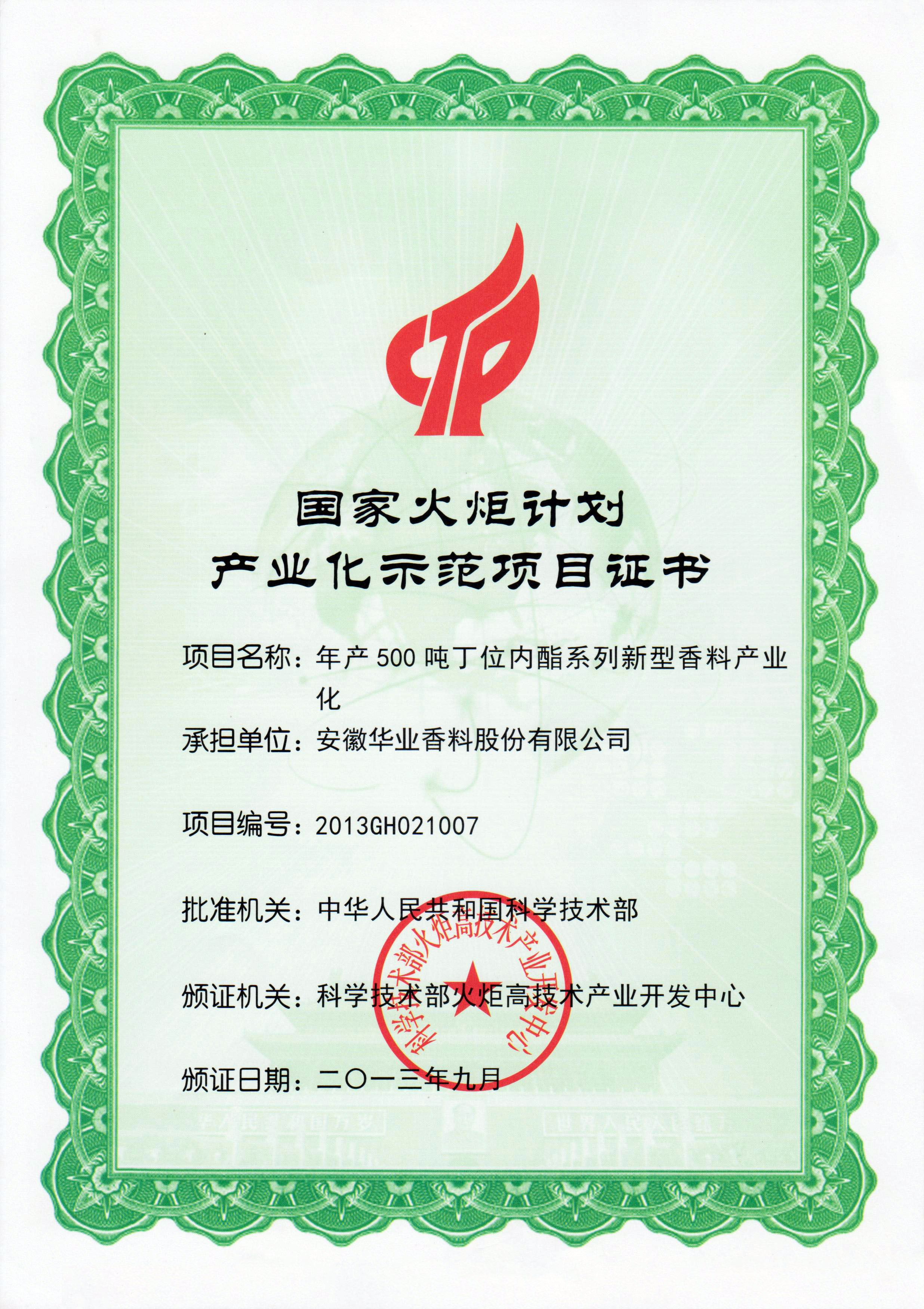 2013年丁位内酯项目被认定为国家火炬计划产业化示范项目