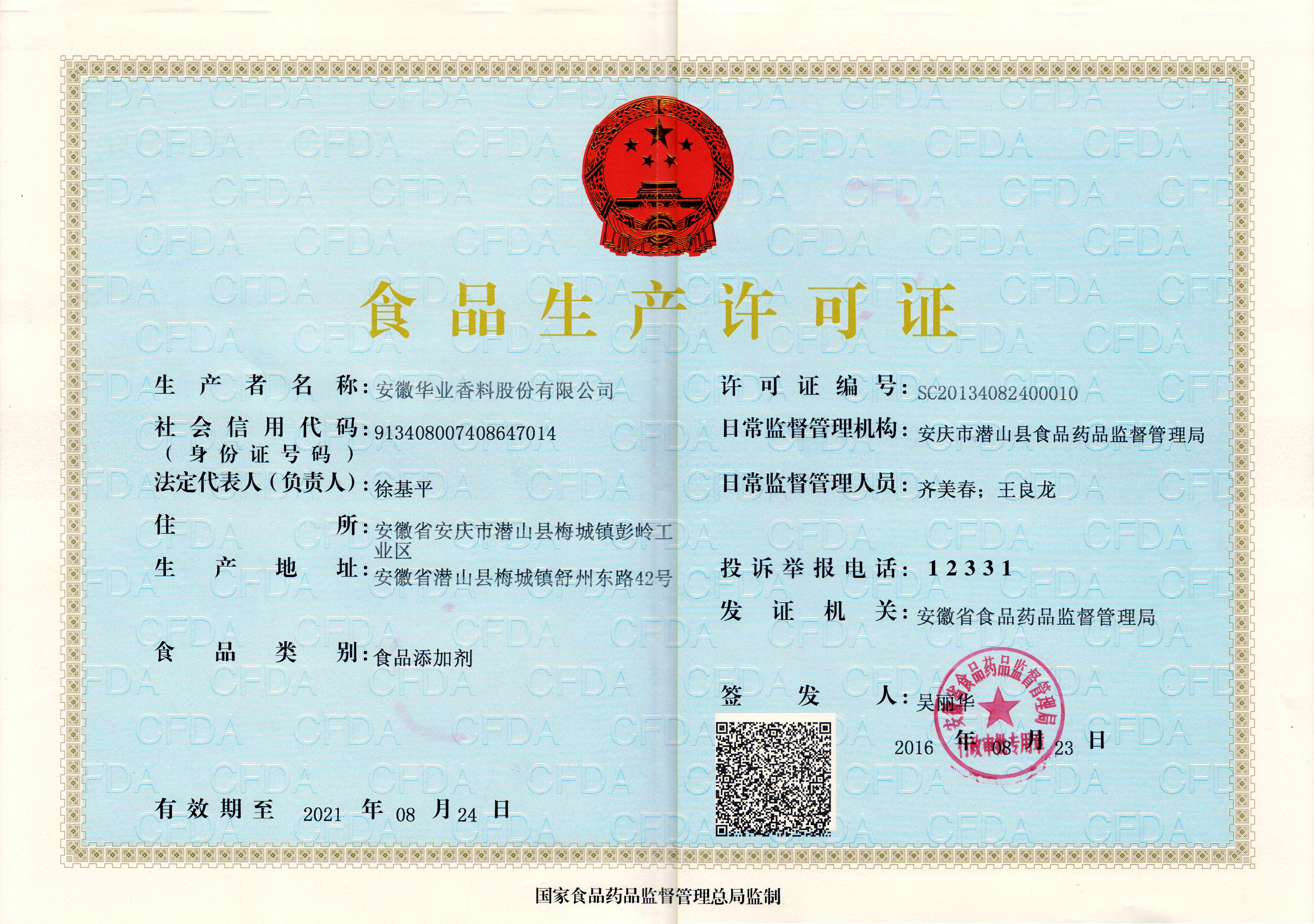 2016年取得《食品生产许可证》
