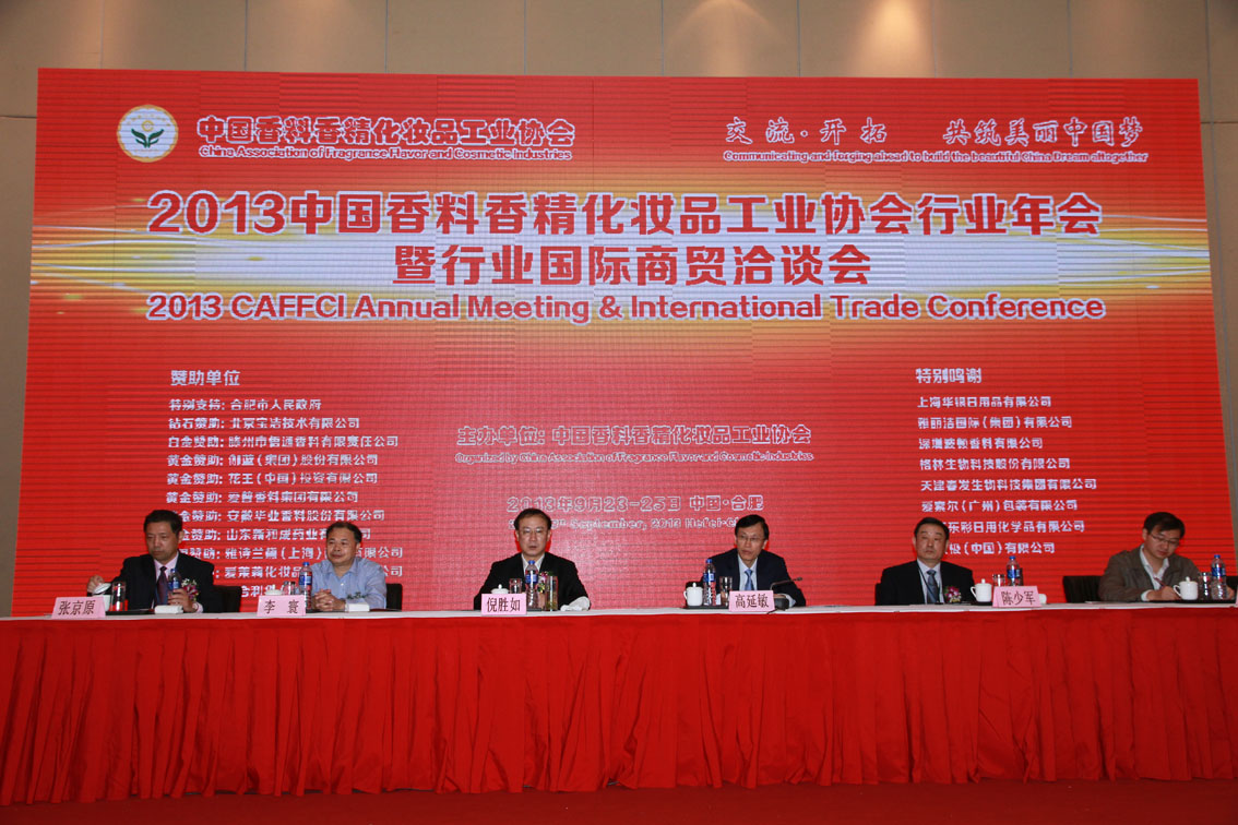2013年中国香料香精化妆品工业协会行业年会暨行业国际商贸洽谈会于9月23-25日在合肥召开,来自全国香料香精、化妆品行业的企业、科研院校的300余名代表聚集巢湖之畔,参加了本届年会。此外,工业和信息化部、国家食品药品监督管理局等相关部门的领导以及来自美国、欧盟、日本、韩国、东盟等相关组织的代表也应邀出席了本届年会。