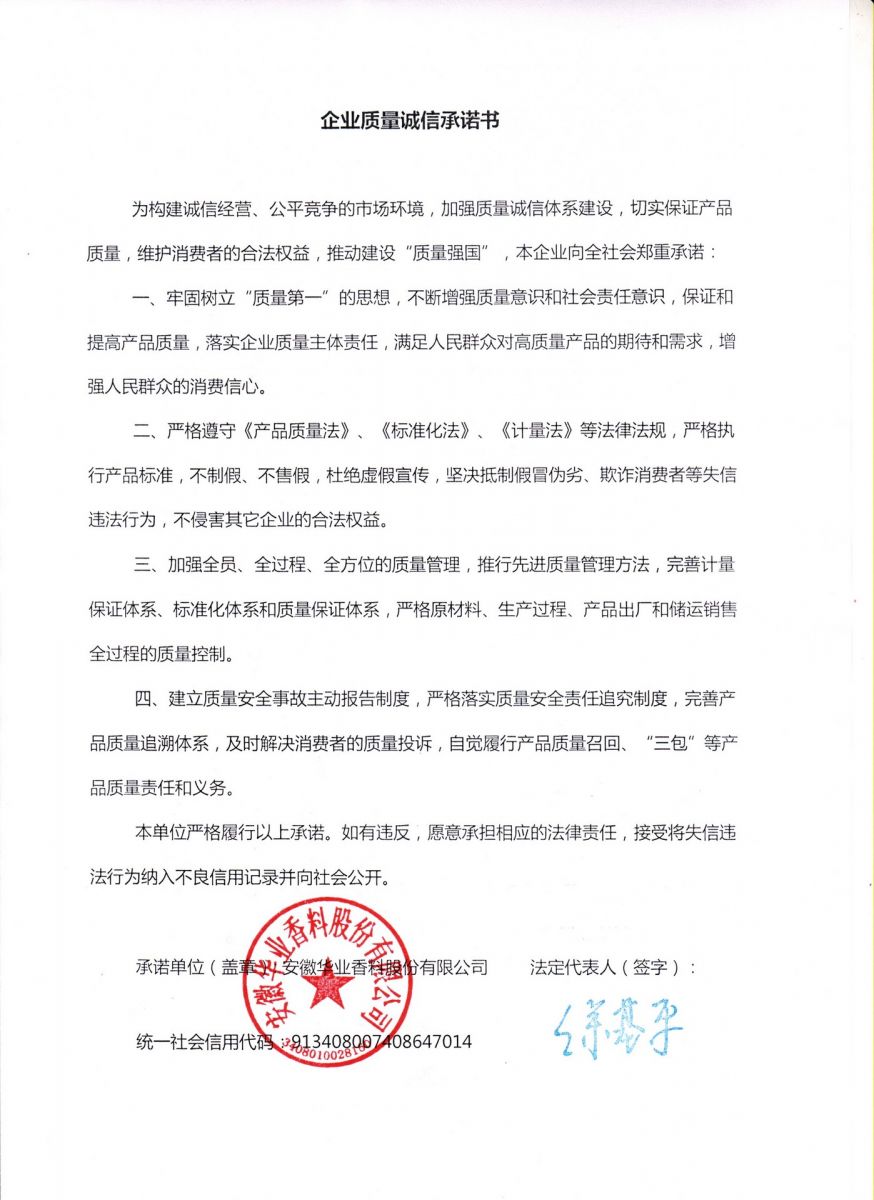 企业质量诚信承诺书