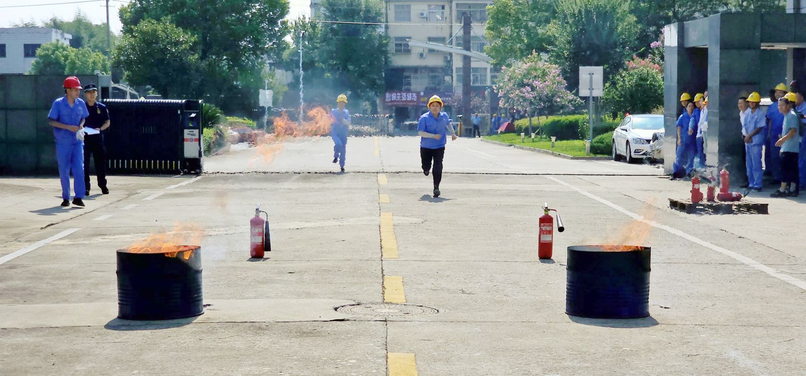 首先开展的是女子二氧化碳灭火器灭火项目。比赛模拟了实际火灾场景,要求选手们在100米长的跑道上拿起灭火器,迅速、准确地使用灭火器扑灭终点处油桶中的大火。参赛女选手们个个精神饱满,摩拳擦掌,斗志昂扬,随着裁判员一声令下,选手们迅速提起灭火器,奔向火源,按照“提、拔、握、压”四个步骤,二氧化碳气雾如冰龙吐息般喷涌而出,瞬间将火势控制并扑灭。整个过程紧张而有序,充分展现了女性员工在紧急情况下的冷静与果敢,赢得了现场观众的阵阵掌声和喝彩。最终,吴琼、储涛、李青桃荣获前三名。
